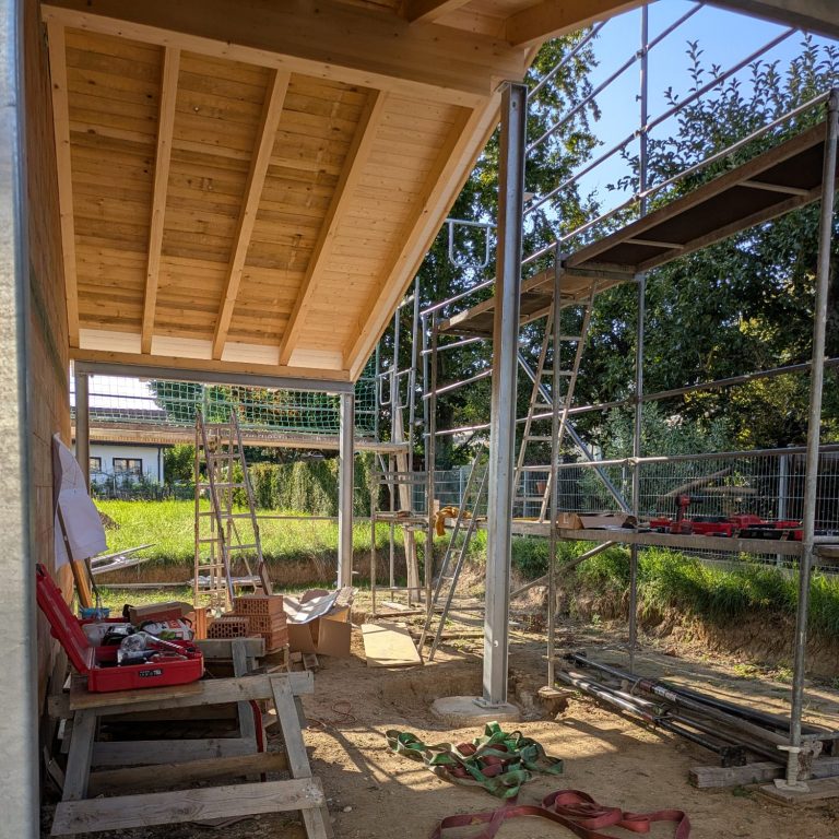 Diese Woche wurde der Dachstuhl durch die Firma Escherle gestellt und gleich zugeschalt!