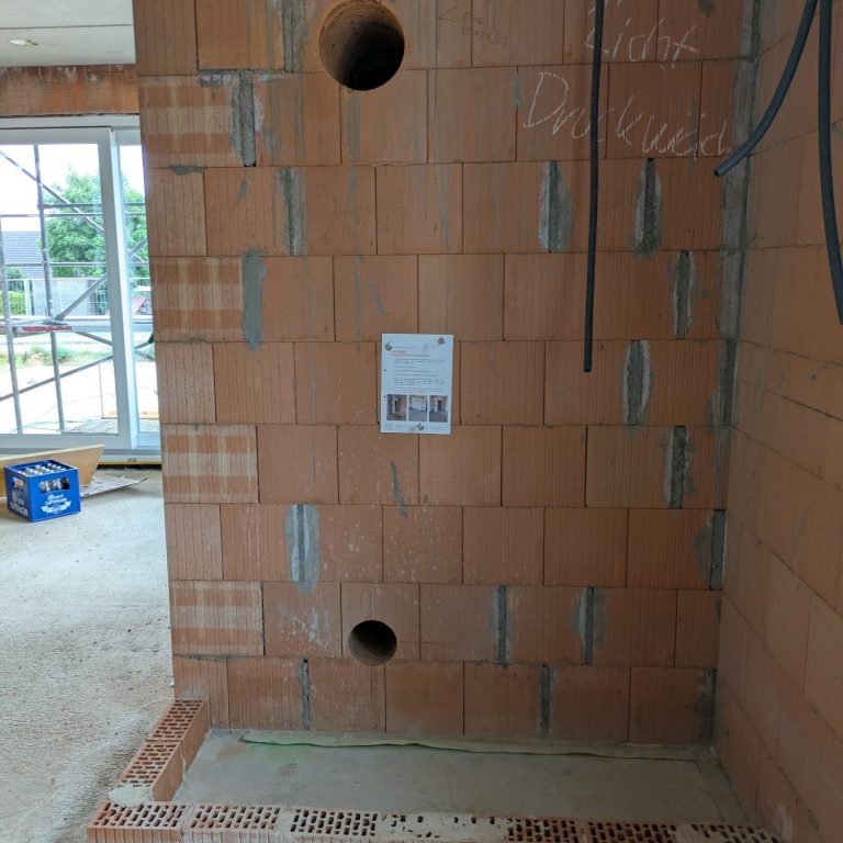 Der Ofenbauer war auch schon aktiv und hat am Boden die Position des Ofens abgemauert und die Wände zum Kamin durchgebohrt.