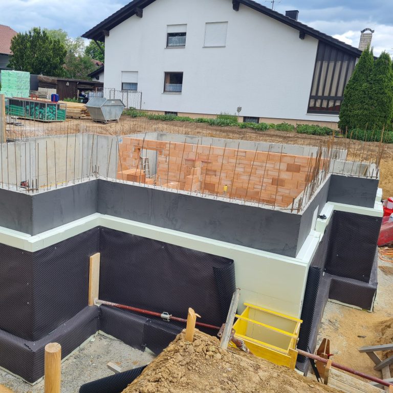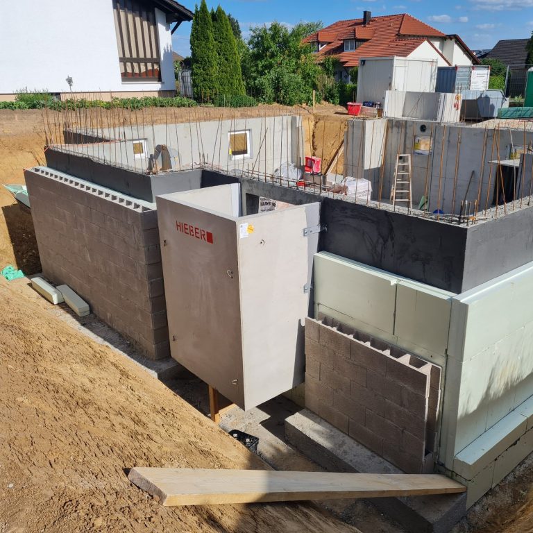 Im Keller stehen schon die ersten Innenwände. Außen wird alles vorbereitet zum Auffüllen.