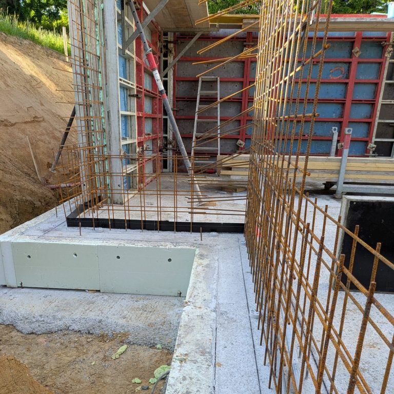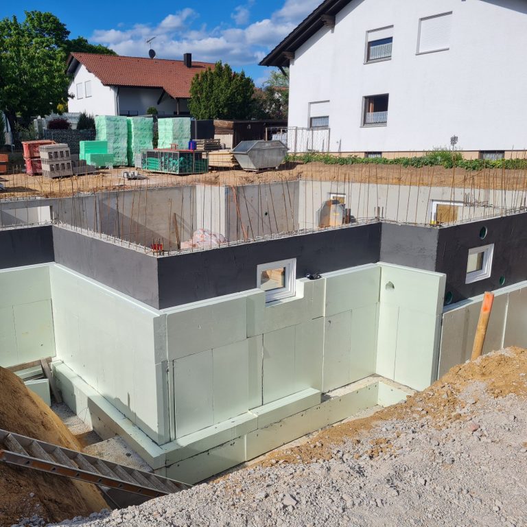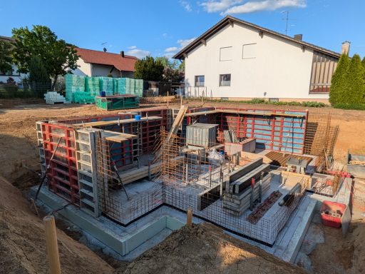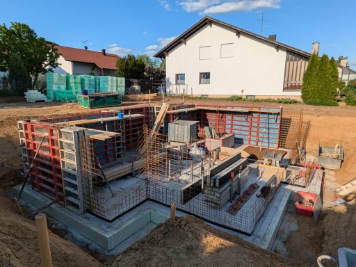 Die Kellerwände sind nun fertig betoniert. Die Wände sind schon teilweise gedämmt und das Garagenfundament steht auch schon fast.