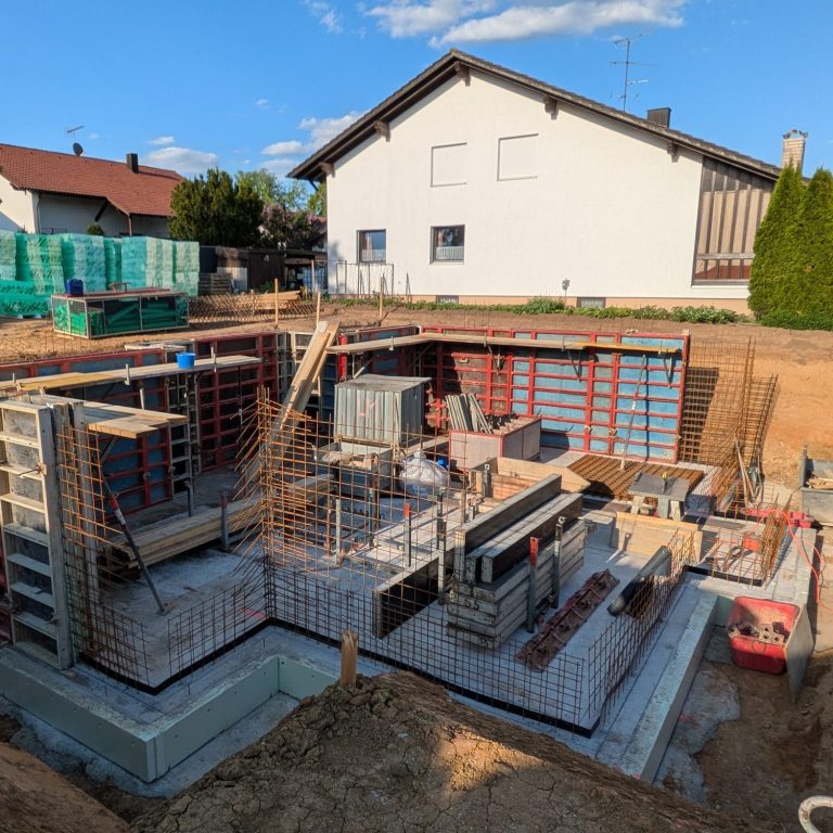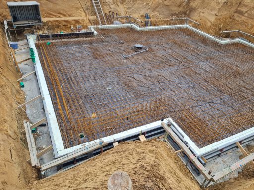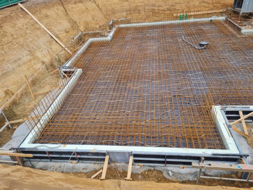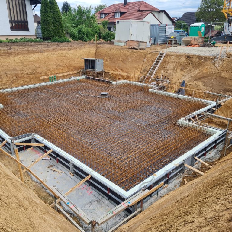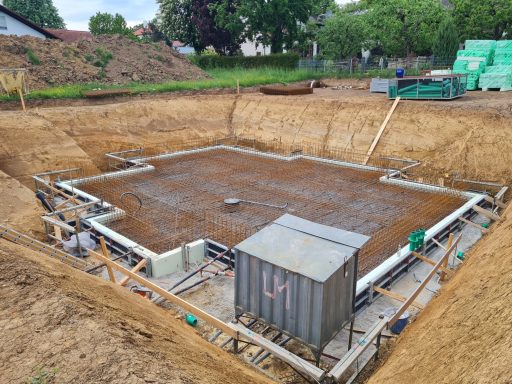Die Firma Lachermeier hat die Dämmung unter der Bodenplatte verlegt, die Bewährung verlegt und morgen wird die Bodenplatte betoniert.