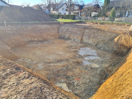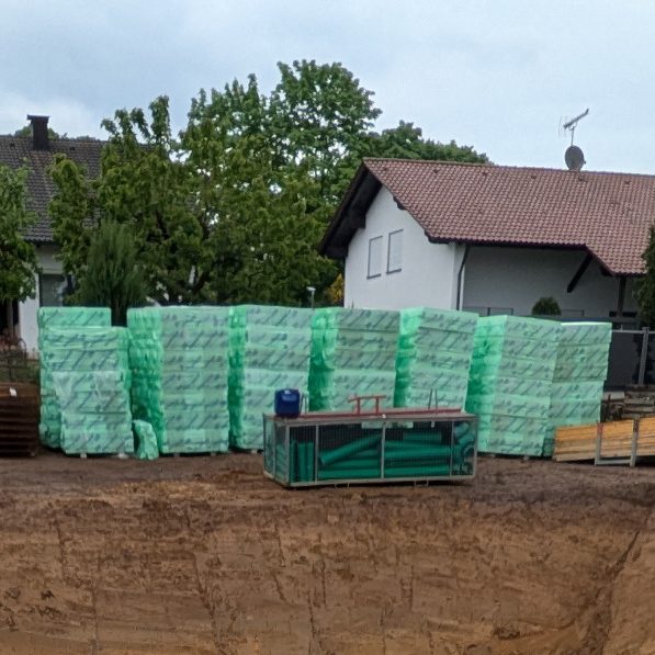 wir warten auf den Rohbauer Fa. Lachermeier, der wartet aber noch auf die Dämmung, die unter die Bodenplatte muss.
