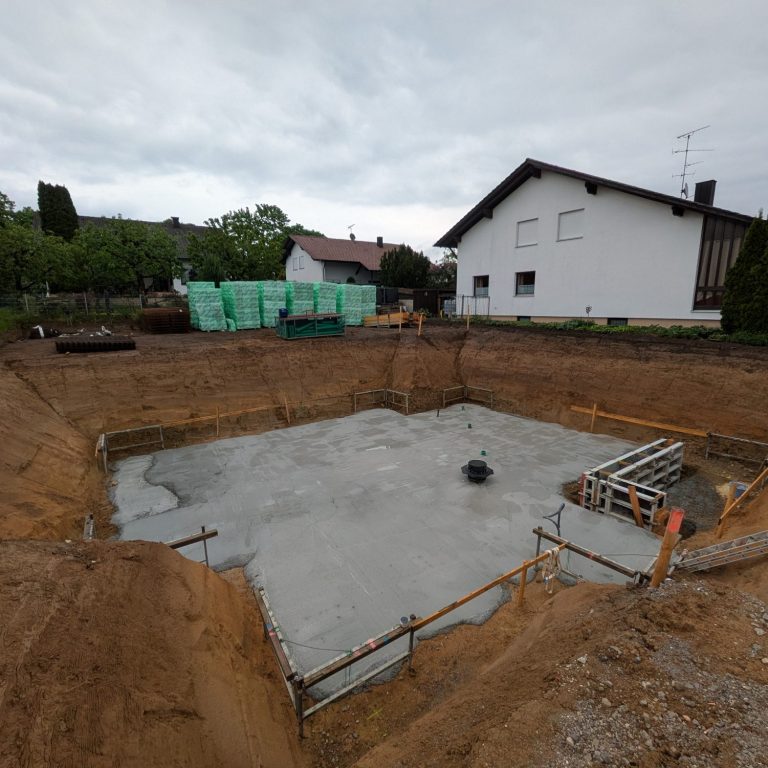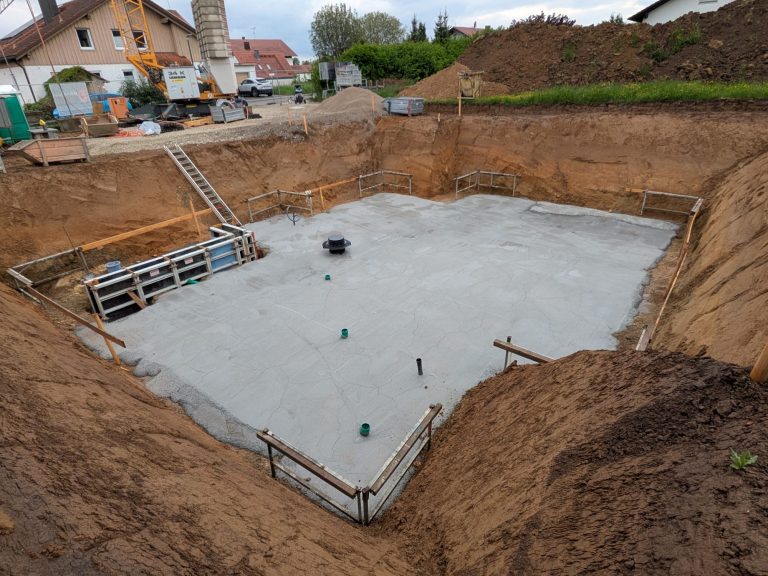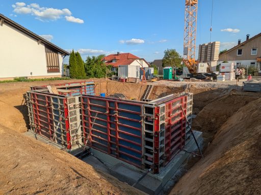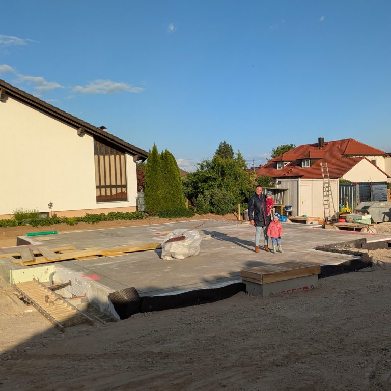 Diese Woche gings rund. Die Firma Lachermeier hat die Dämmung unter der Bodenplatte verlegt, die Bodenplatte betoniert und dann am Samstag sogar noch den halben Keller betoniert. Mit 5 Maurern auf der Baustelle geht was voran! Cool!